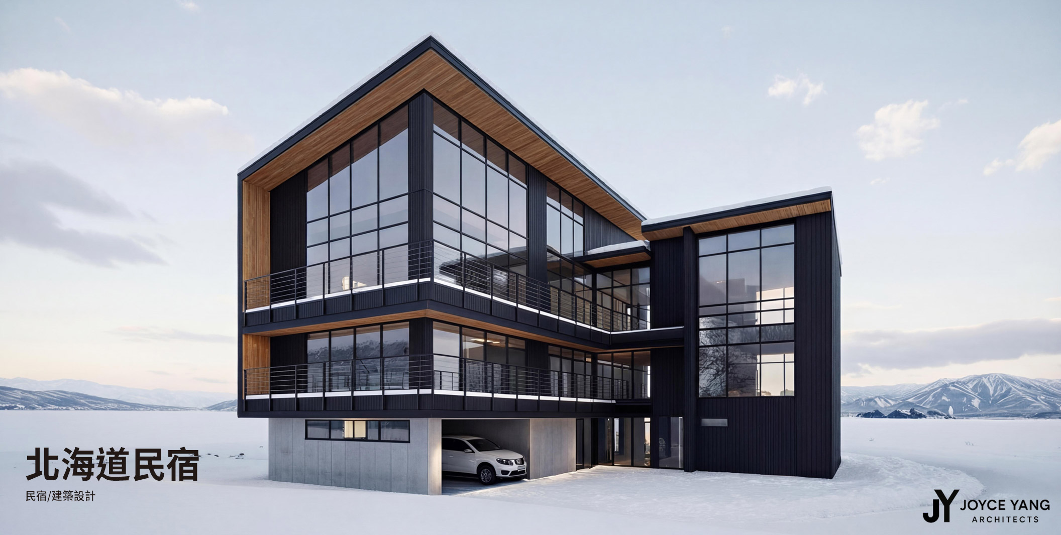 以雙量體與挑空光井引入自然光與景觀,結合北海道在地建材,形塑回應四季變化的溫暖民宿空間。
